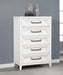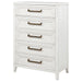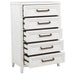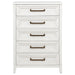 Add easy storage and inviting style to your bedroom with a modern five-drawer chest. It's tall, compact silhouette conserves space while adding welcome storage and organization. The chest features a distressed white finish to highlight wood grain details for a fresh, organic effect in your bedroom. Antique brass-toned bar pulls add contrast and definition on trimmed drawer fronts, creating inviting texture and depth. Tapered legs finish off this inviting look and a tip over restraint is included for added safety. Key Features: • A modern five-drawer storage chest offers a clean-lined silhouette and lots of storage • Distressed white finish highlights wood grain details and bar hardware to create texture and depth • Bar-style drawer pulls have a slight U-profile and a antique brass-toned finish that adds contrast • Dresser includes six drawers of equal size, perfect for clothing, accessories and even linens • Tip over restraints are included to add safety and peace of mind to this stylish set