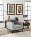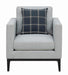 Curl up with a good book and unwind after a long day. This cozy chair is the perfect foundation for casual relaxation. A comfortable back and seat cushion allow for hours of leisurely lounging. Soft, grey upholstery gives it a touch of subtle style. Its simple, dark colored frame cleverly matches its dark accent pillow, balancing out its look with classic glamour.