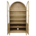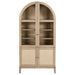 Elevate your space with this sophisticated vitrine cabinet, designed to showcase your most treasured items with style. Featuring two wood-framed tempered glass doors, the upper section offers four tiers of shelving, perfect for displaying decor, dinnerware, or collectibles. The lower section of the cabinet provides additional storage with two hand-woven cane doors and a shelf inside for hidden organization. Crafted from solid wood, engineered wood, and oak veneer, this display cabinet offers both open display and concealed storage options. Its timeless arched design and natural wood finish make it a perfect addition to dining rooms, living spaces, or home offices. Key Features: • Elegant beige oak vitrine cabinet with arched design and wood-framed tempered glass doors • Four tiers of shelving in the upper section for showcasing decor or dinnerware • Lower two-door cabinet with a shelf for concealed storage • Crafted from solid wood, engineered wood, and oak veneer for durability • Hand-woven cane doors in the lower section add a natural, artisanal touch