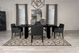 Introducing a beautiful dining room collection with clean, modern lines. The dining table boasts a oak veneer top with a black finish and a stunning tambour base design featuring fluted patterns on the double pedestal legs. The mid-century-inspired dining chairs have cushioned arms wrapped in durable charcoal grey fabric, offering comfort and style for any casual dining room. Key Features: • Introducing a modern dining room collection with a stunning tambour base design • Dining table features an oak veneer top with a black finish • Double pedestal legs feature fluted patterns for a mid-century inspired look • Dining chairs have cushioned arms wrapped in durable charcoal grey fabric • Comfort and style for any casual dining room